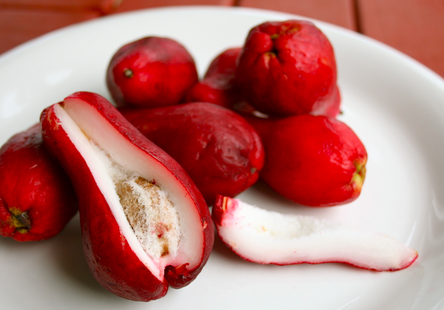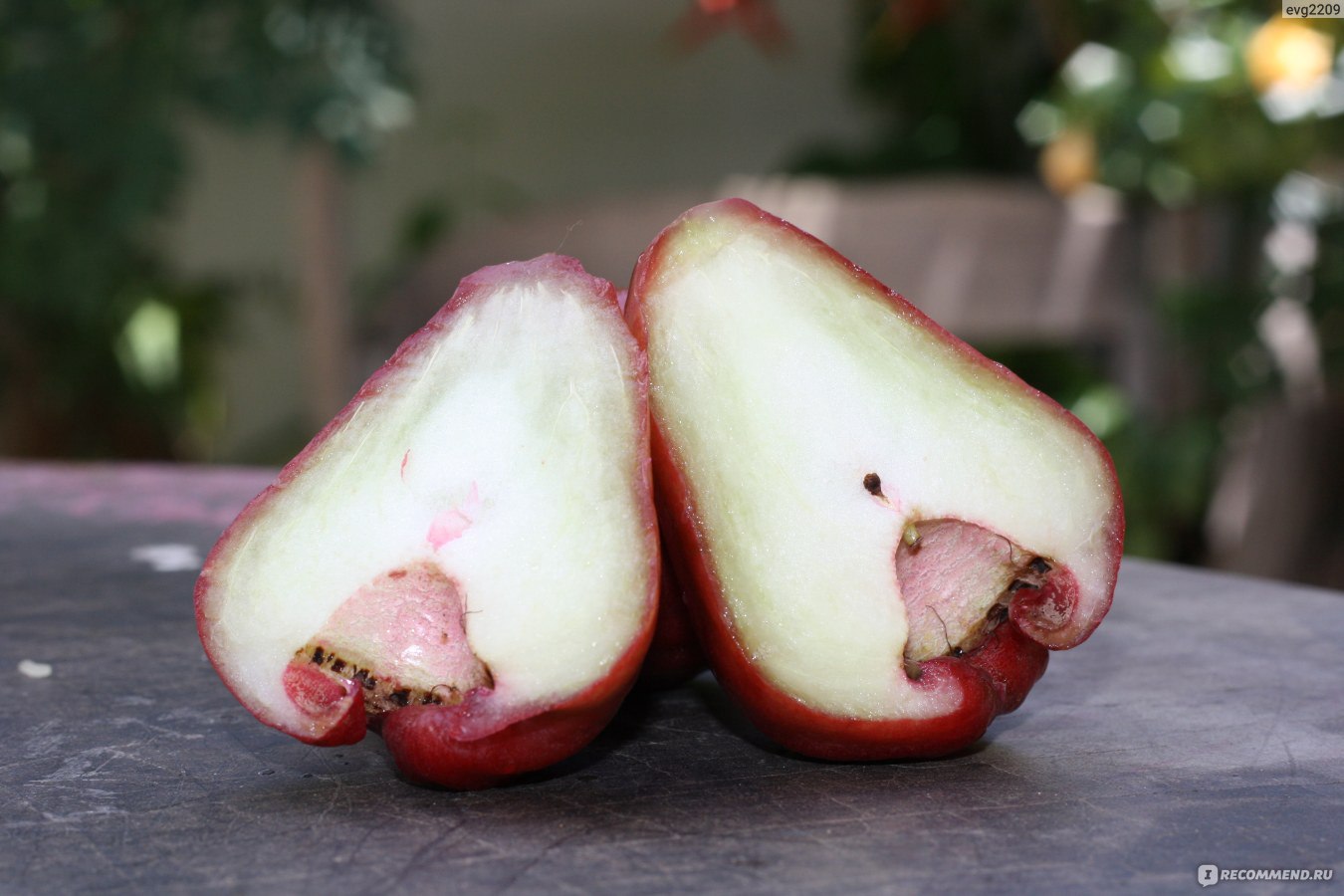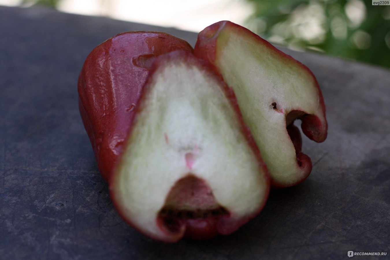 Шкірка тонка і гладка, як у яблук і груш. Щобільше, саме так думки народу і розділилися: одним джамбоза за смаком нагадує яблука, іншим груші. Правда, деяким він нагадує ще й ківі.