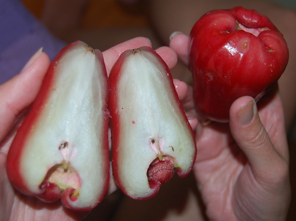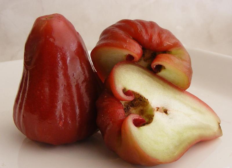 Плоди джамбози розміром із середнє яблуко. Бувають жовтого, рожевого і червоного кольору, різної насиченості.